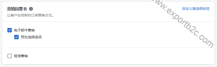 建议按照上图设置,营销同意书其实就是让客户在结账的时候也能够订阅邮件,从而有利于我们后续开展邮件营销。‘预先选择选项’要勾选上,这样结账页面默认买家是允许我们给其发邮件的,如下图所示: