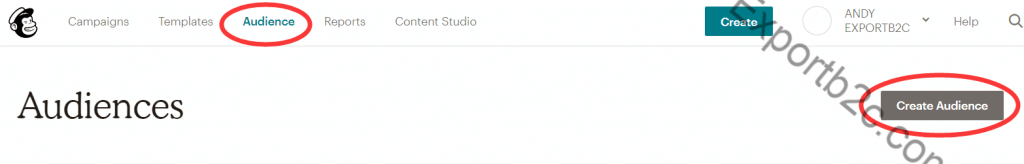 1)在Mailchimp后台点击导航栏‘Audience’,之后选择‘Create Audience’,如下图所示: